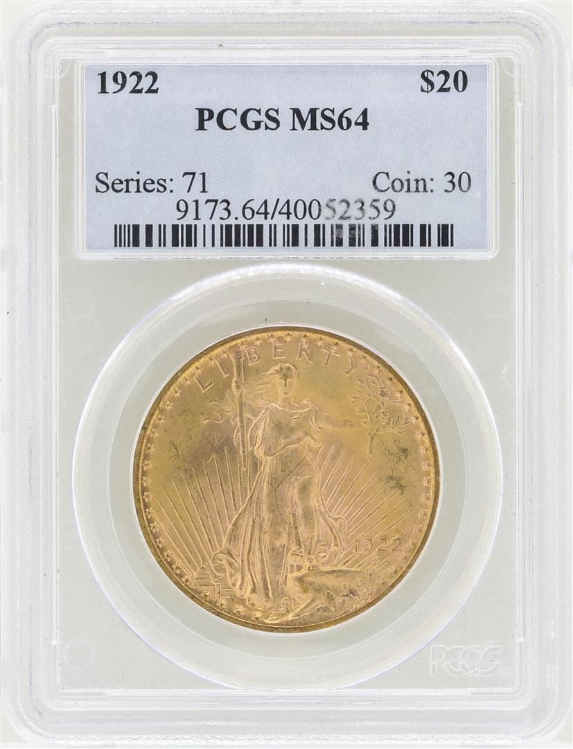 One 1922 $20 St. Gaudens Double Eagle Gold Coin PCGS MS64. PCGS Graded.