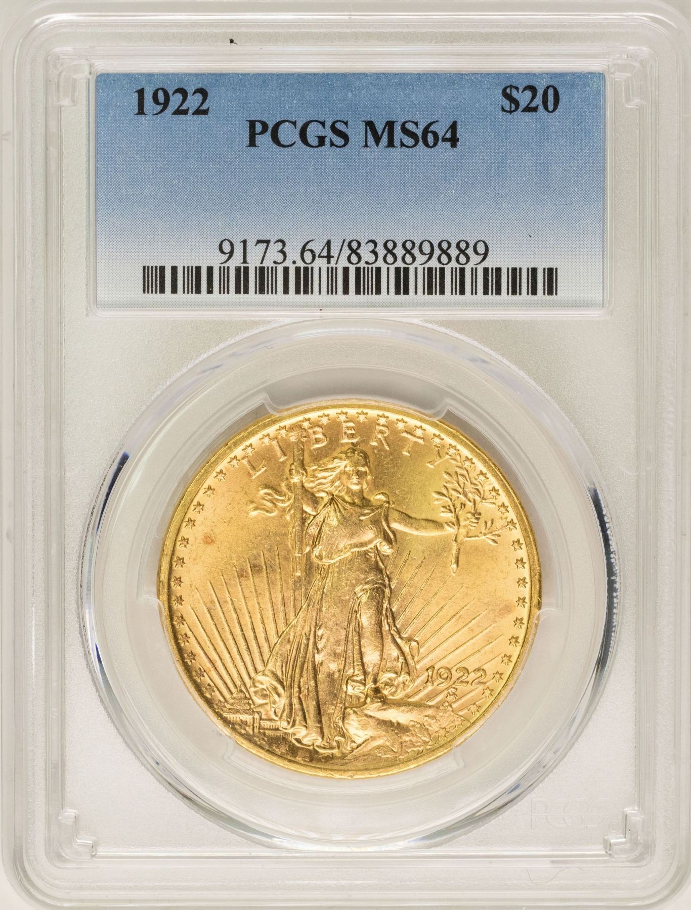 One 1922 $20 St. Gaudens Double Eagle Gold Coin PCGS MS64.