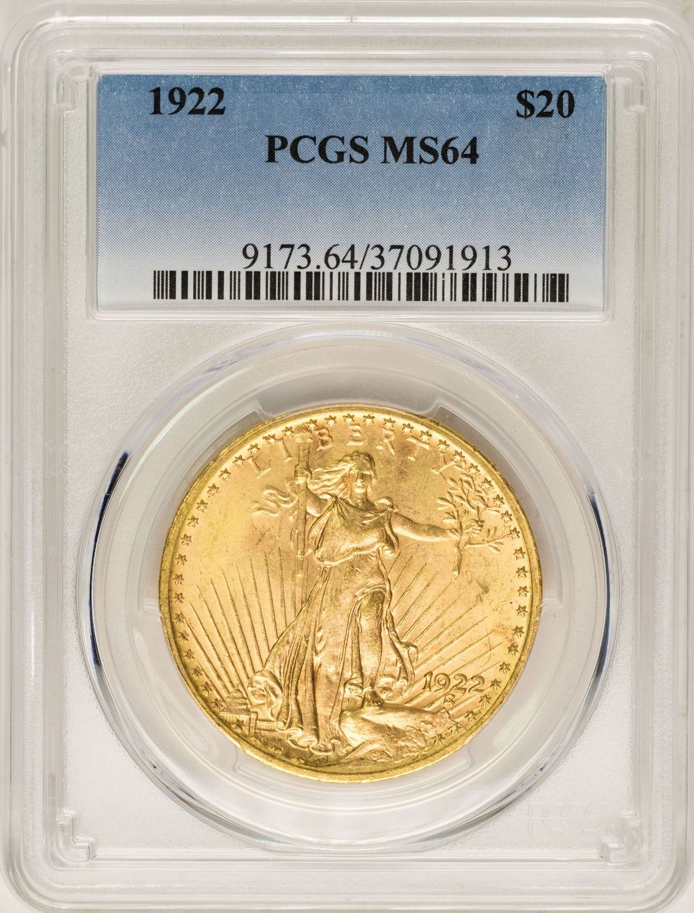 One 1922 $20 St. Gaudens Double Eagle Gold Coin PCGS MS64.