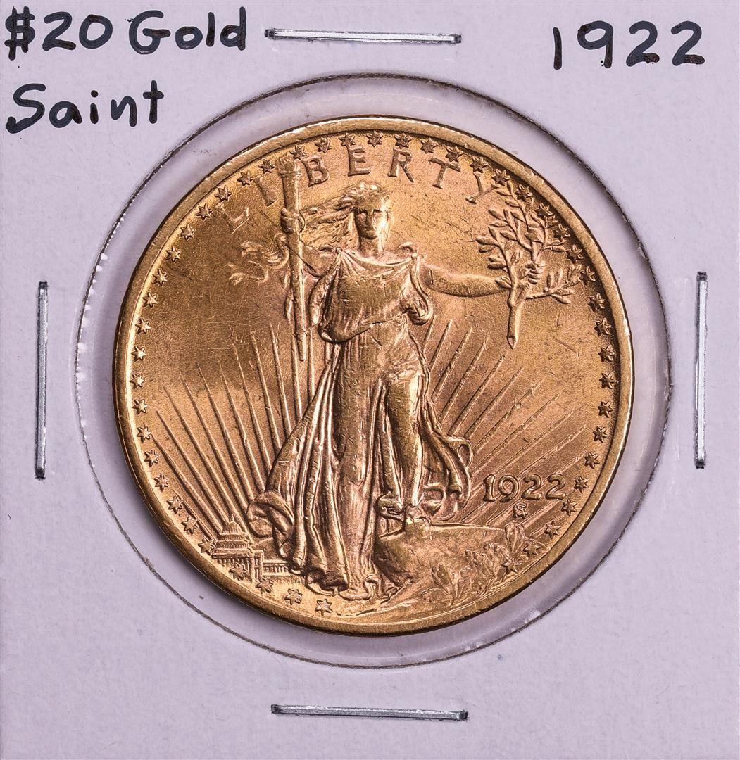 One 1922 $20 St. Gaudens Double Eagle Gold Coin.