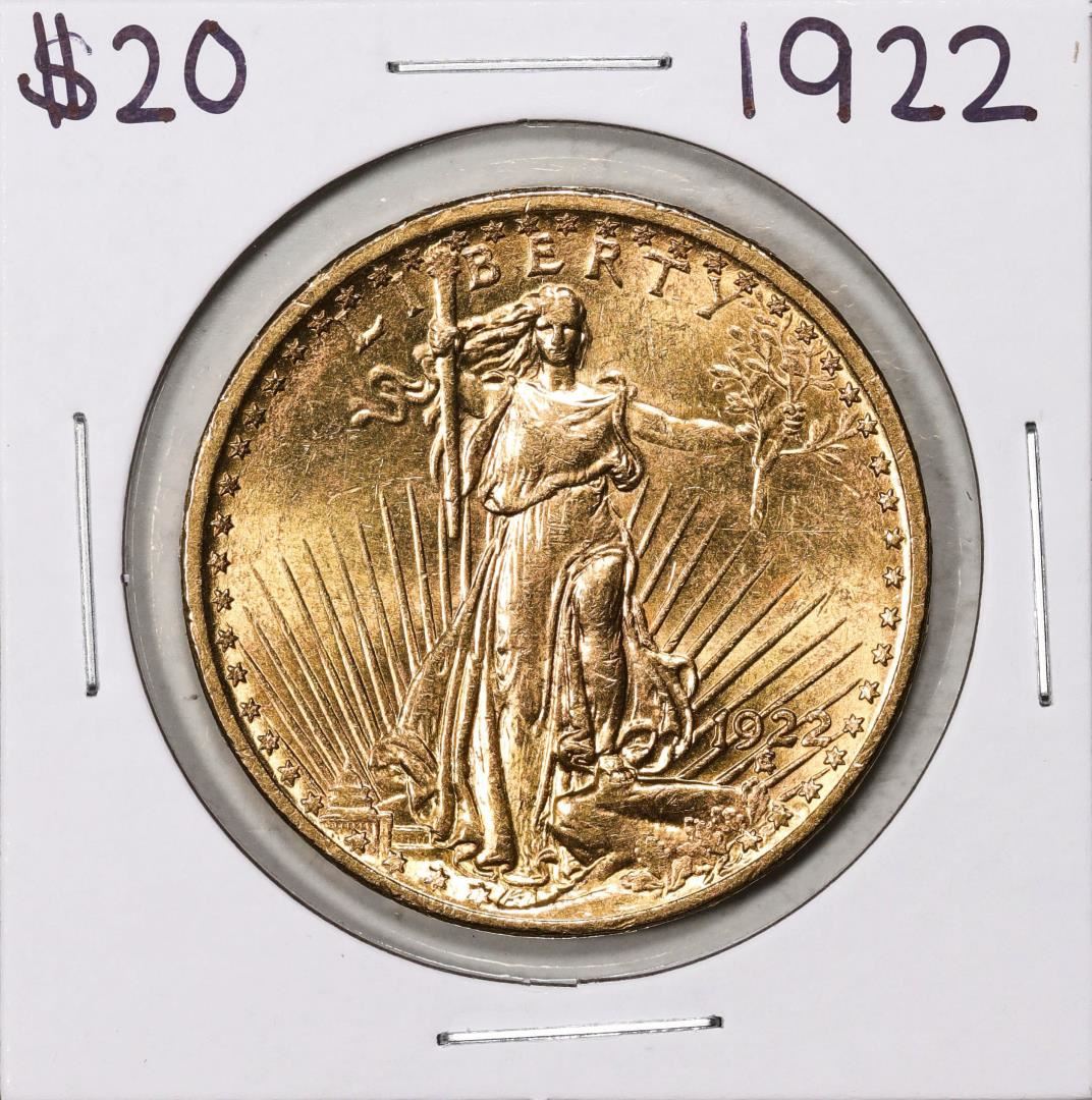 One 1922 $20 St. Gaudens Double Eagle Gold Coin.