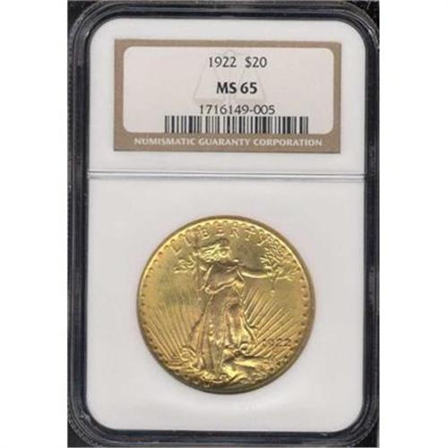 <b>1922 $20 St. Gaudens. NGC graded MS65.</b> NGC Pop: 368/8. The eagle's wings and body are exceptionally free of bagmarks on this specimen. Unrivaled in terms of exterior preservation for the MS65 grade, both sides of this golden beauty are well frosted and for all intents and purposes tone-free. Vast quantities of 1922-dated double eagles were exported in the 1920s and 1930s, where they remained until after World War II. Today the date is abundant in grades up to MS64. However, MS65 coins are scarce in comparison to such dates as 1924 or 1928, but the possibility still exists to find a nice one like the present offering. A carefully picked MS65 is about ideal, in most collectors' opinions <b>(PCGS # 9173)</b> <i>