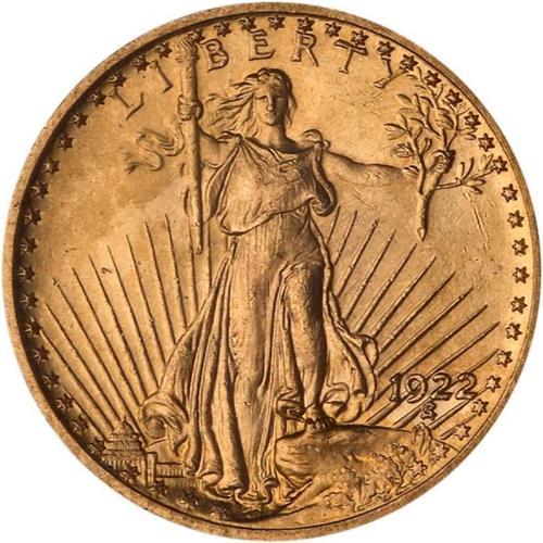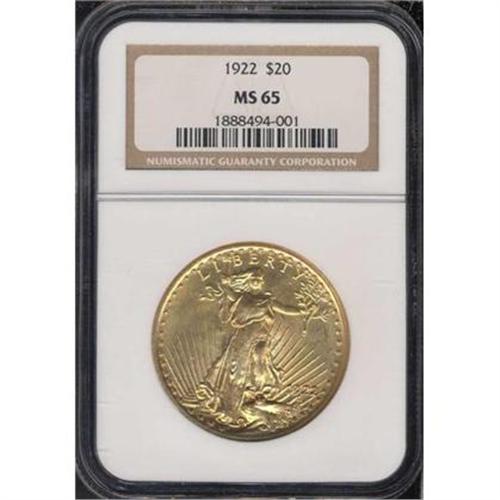 <b>1922 $20 St. Gaudens. NGC graded MS65.</b> NGC Pop: 368/8. Completely original with spectacular mint brilliance that is almost prooflike in its radiance, fresh color over nearly pristine surfaces. Only a few tiny bagmarks here and there <b>(PCGS # 9173)</b> <i>