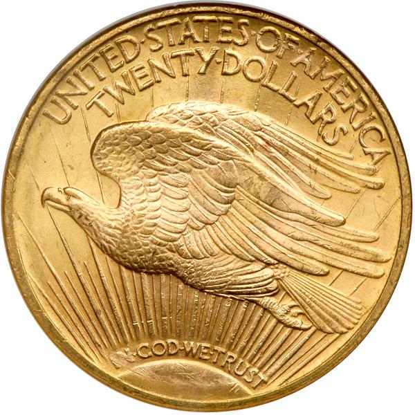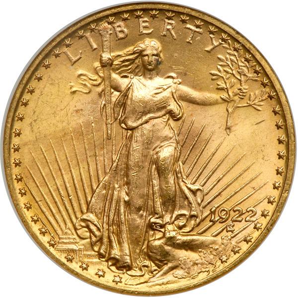 1922 $20 St. Gaudens. NGC graded MS-65. Mostly untoned. A frosty gem with eruptions of light gold luster on both sides. Absolutely fully struck, there is no limitation to the detail at the figure of Liberty nor is there any diminishment on the eagle with its soaring wings. Mintor scuffing only on the sun and IN of the reverse motto. Pop 469; 12 finer (PCGS # 9173) .