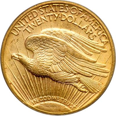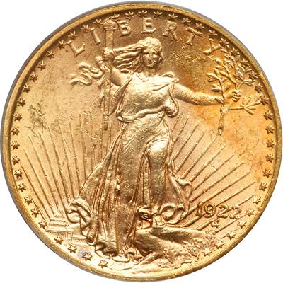 1922 $20 St. Gaudens. PCGS graded MS-62. We note a few copper spots on the obverse as well as the reverse. Nice luster (PCGS # 9173) .