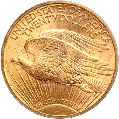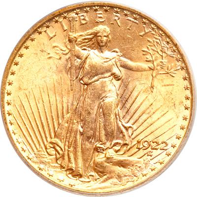1922 $20 St. Gaudens. PCGS graded MS-63. Golden orange toning, the fields swirl with luster (PCGS # 9173) .