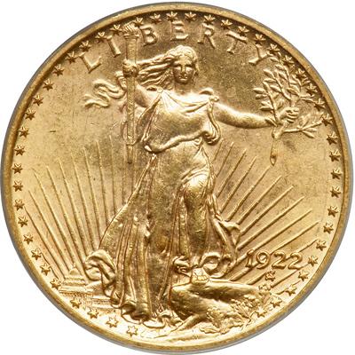 1922 $20 St. Gaudens. PCGS graded MS-63. Mostly untoned with lustrous surfaces (PCGS # 9173) .