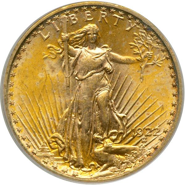 1922 $20 St. Gaudens. PCGS graded MS-65. Sparkling with golden mint luster, a Gem by any definition of the term. In light of that, we can also say this piece is nicely struck with extremely full details on both sides. Pop 1183; 10 finer, 3 in 65+, 7 in 66 (PCGS # 9173) .