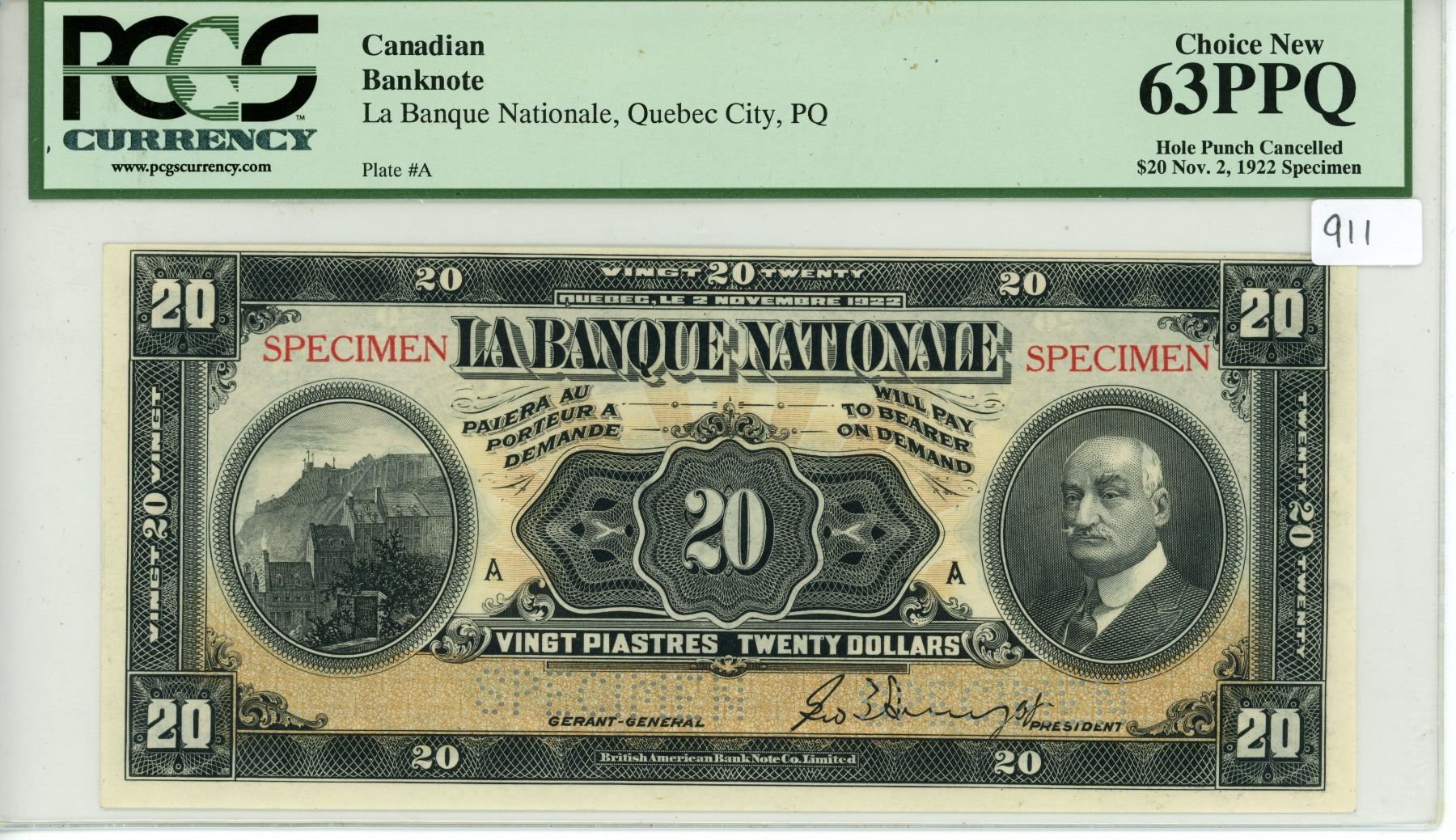 1922 $20 issue Quebec National bank Specimen bill - PCGS graded, Choice New 63PPQ