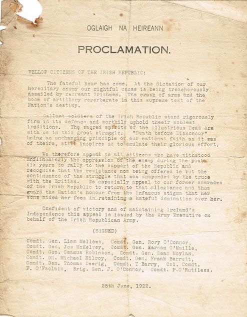 Single sheet, mimeograph.Proclamation issued by the Anti Treaty Forces on the day that the Civil War began. "Fellow citizens of the Irish Republic. The fateful hour has come. At the dictation of our hereditary enemy our rightful cause is being treacherously assaulted by recreant Irishmen". Printed signatories include no less than 12 "Generals" of the IRA, seven of whom lost their lives over the course of the Civil War.