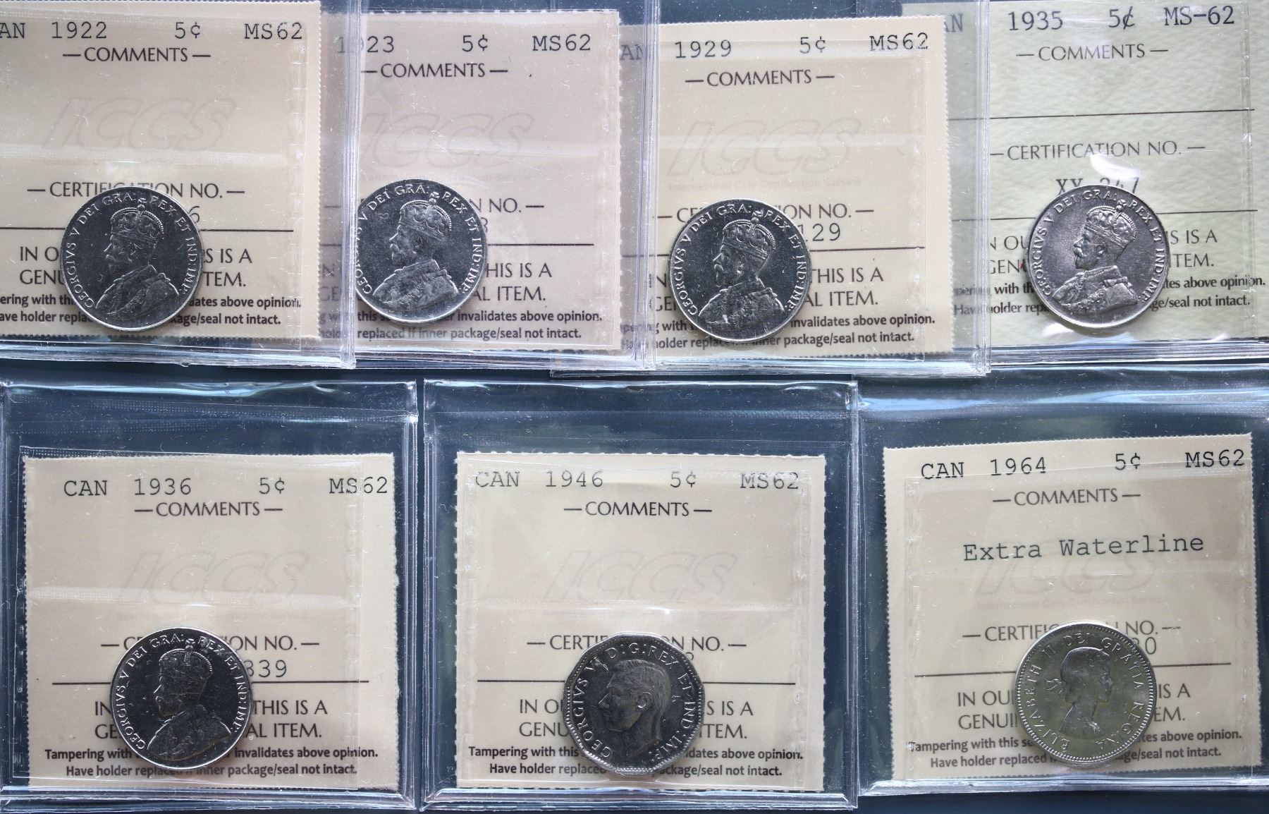 1922 5¢, 1923, 1929, 1935, 1936, 1946, 1964 EWL, all 7 coins ICCS graded Choice Mint State-62.