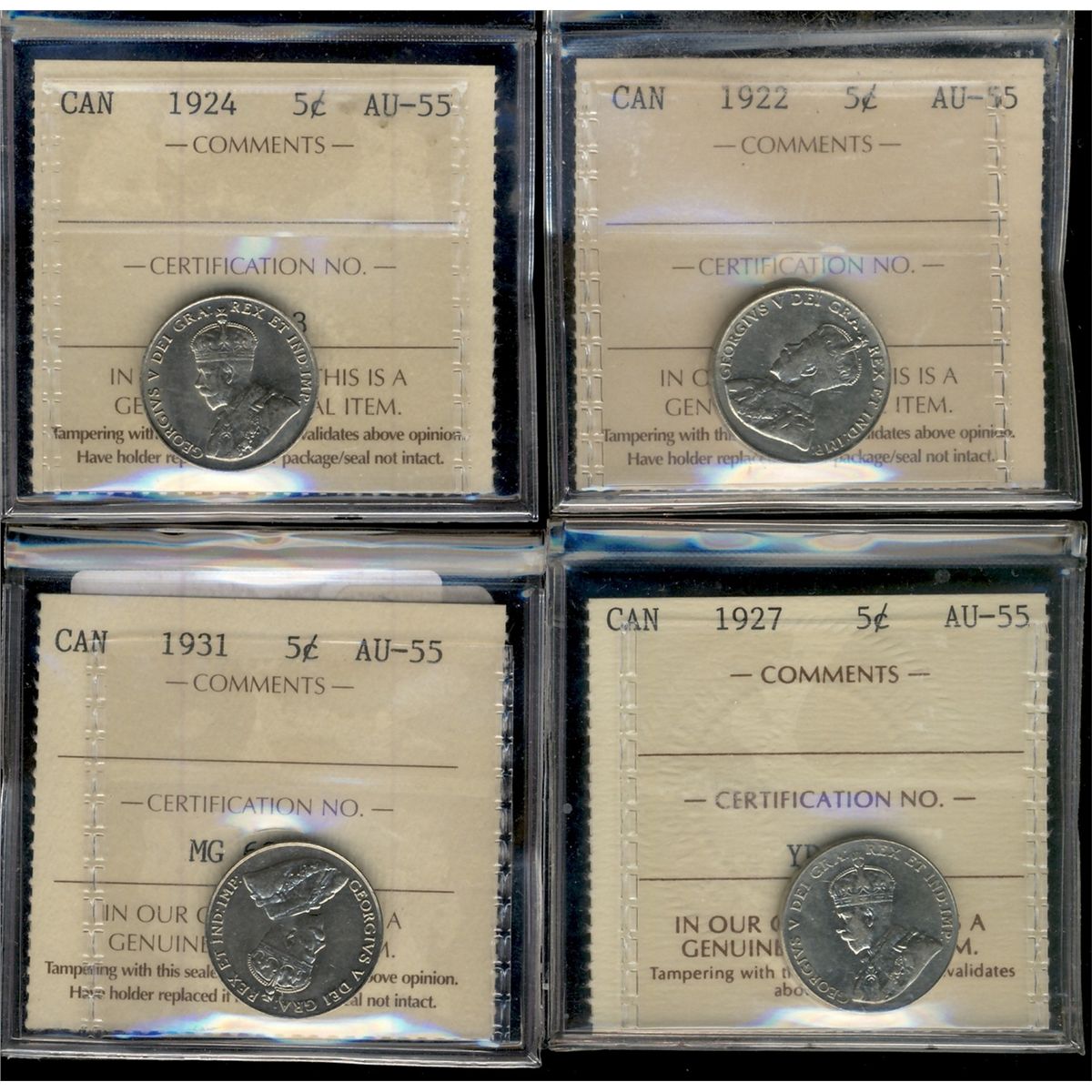 1922 5¢, 1924, 1927 & 1931 all ICCS AU55. Lot of 4 coins.