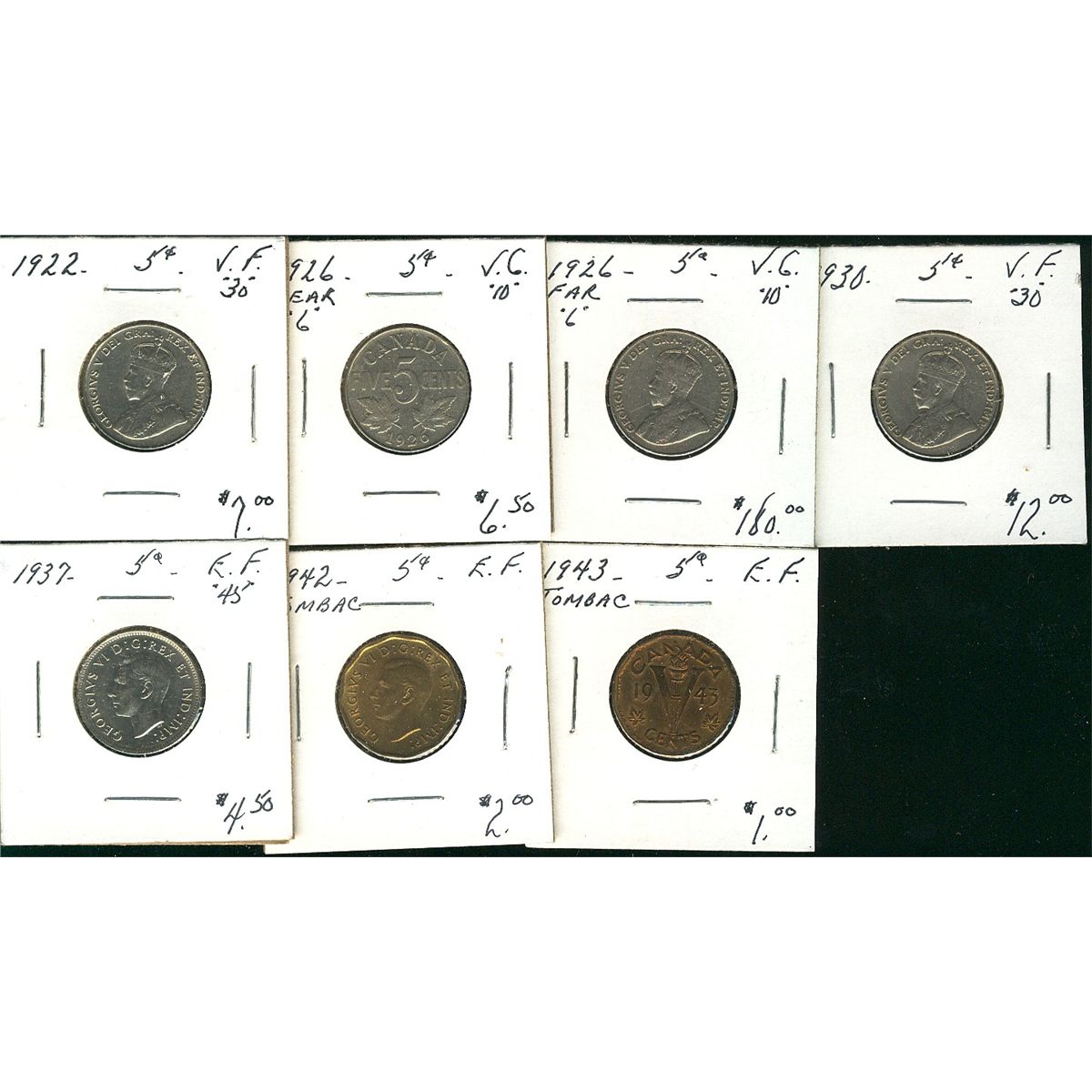 1922 5¢, 1926 Nr, 1926 Fr, 1930, 1937, 1942 Tom & 1943 Tom. Lot of 7 coins all VG+ or better. (PBA).