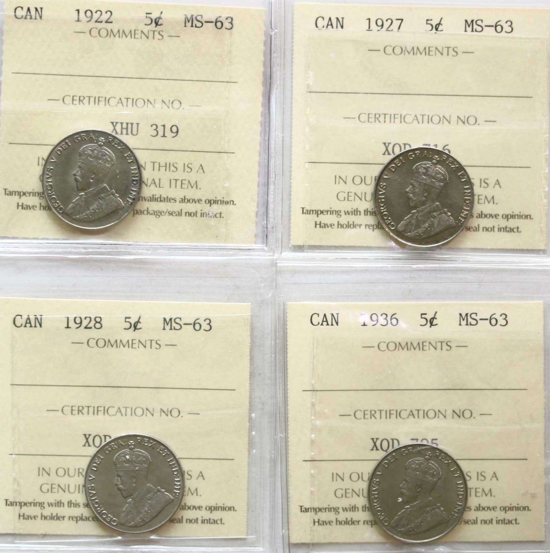 1922 5¢, 1927, 1928, 1936 All 4 coins ICCS Choice Mint State-63.