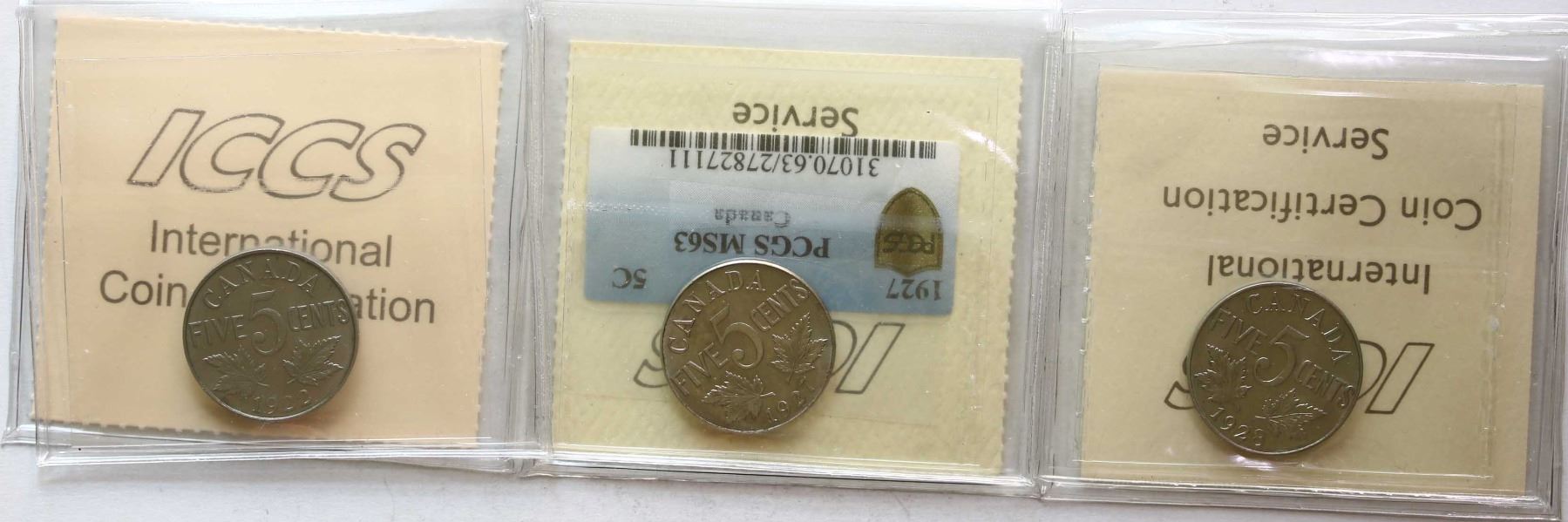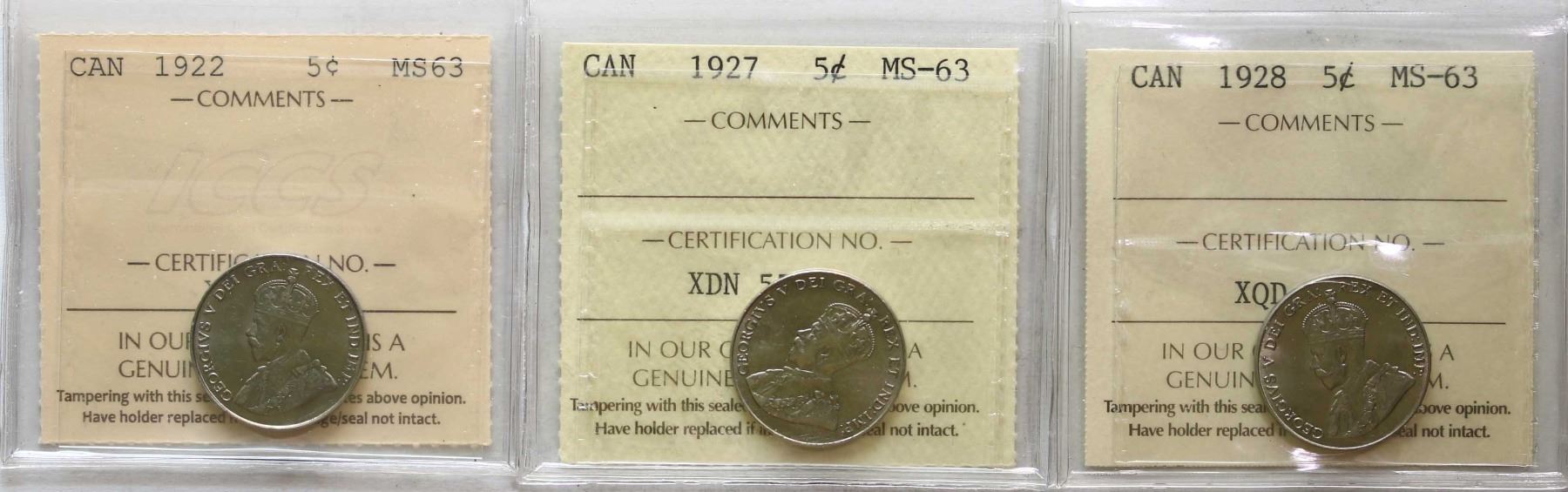 1922 5¢, 1927, 1928 All 3 coins ICCS Choice Mint State-63.