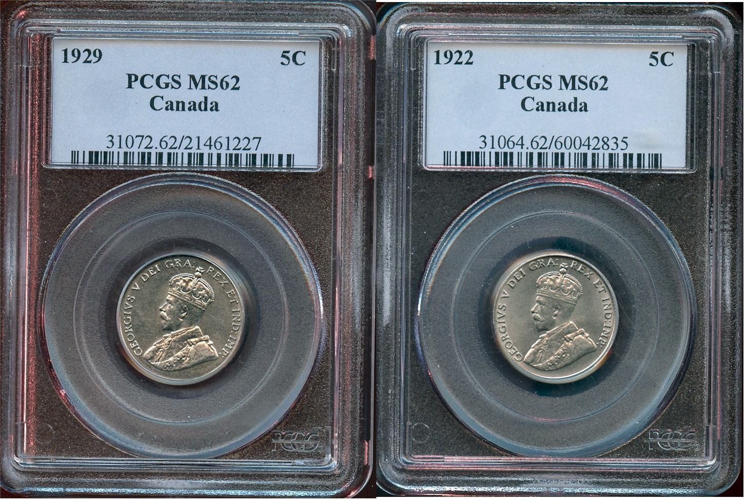 1922 5¢ & 1929 5¢ PCGS Choice Mint State-62. lot of 2 coins