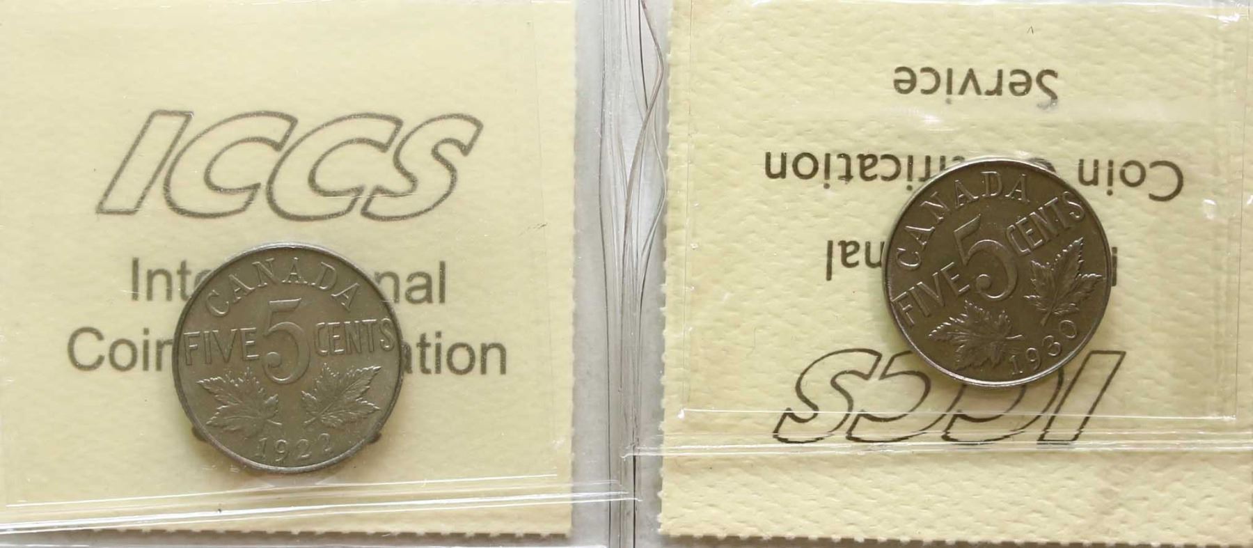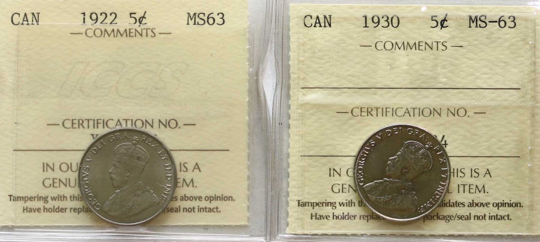 1922 5¢, 1930 Both coins ICCS Choice Mint State-63