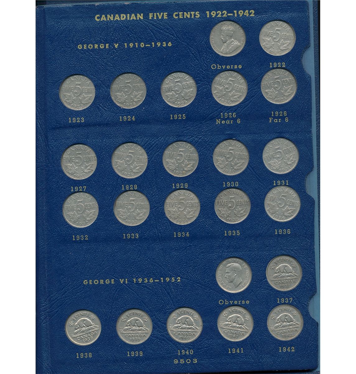 1922 5¢ - 1965 Complete Date Set; includes the 1925 & 1926 Fr. 51 pcs housed in old Blue Whitman holder, VG to MS.