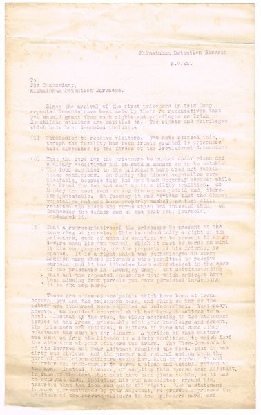 Mimeograph copy letter sent to the Commandant at Kilmainham from the leaders of Republican prisoners including Oscar Traynor and Tom Barry, demanding 'that you should grant them such rights and privileges as Irish Republican soldiers are entitled to...'. Also with a 3pp mimeograph circular titled "An Irish Priest's Appeal to the Men & Women of Ireland" dated 3 July 1922 and signed as 'Colm Cille' and Vol. 1 No. 3 of Ná Bac Leis, the Ballykinlar Internment Camp newsletter. (3 items)
