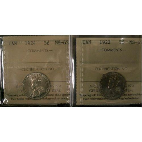 1922 5¢ ICCS MS62 and 1924 5¢ 5¢ ICCS MS63. Lot of two minstate examples.