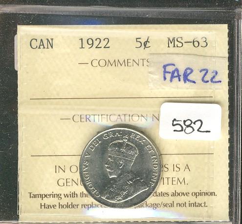 1922 5¢ ICCS MS63. Looks to be a Far variety, but not identified on holder.