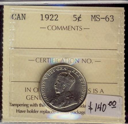 1922 5¢ ICCS MS63