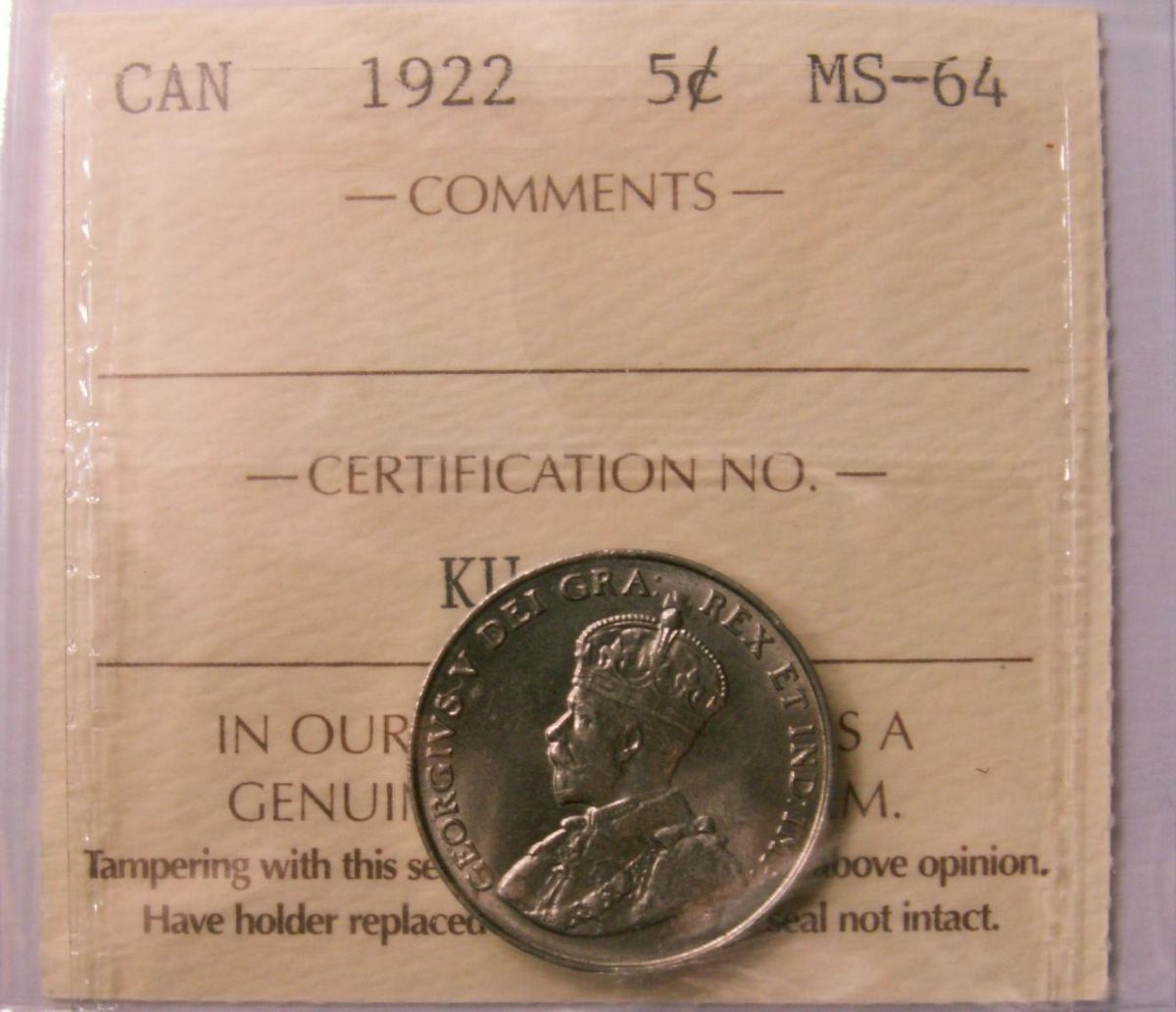 1922 5¢ ICCS MS64. Flashy with lots of lustre.