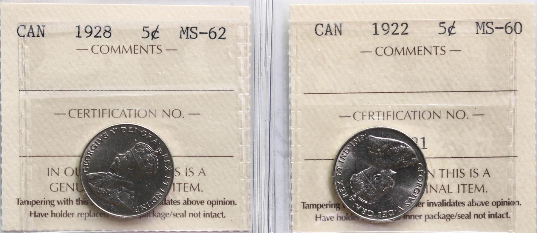 1922 5¢ Mint State-60 & 1928 Choice Mint State-62. Lot of 2 ICCS graded coins.