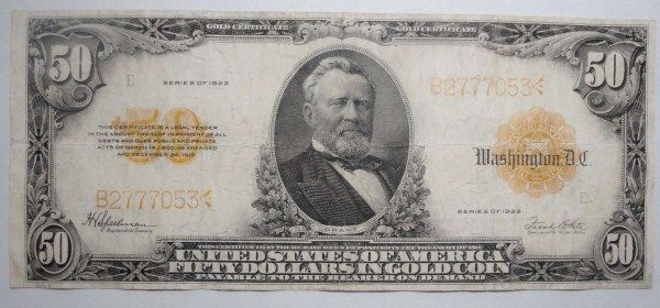 1922 $50 GOLD CERTIFICATE FINE, RARE