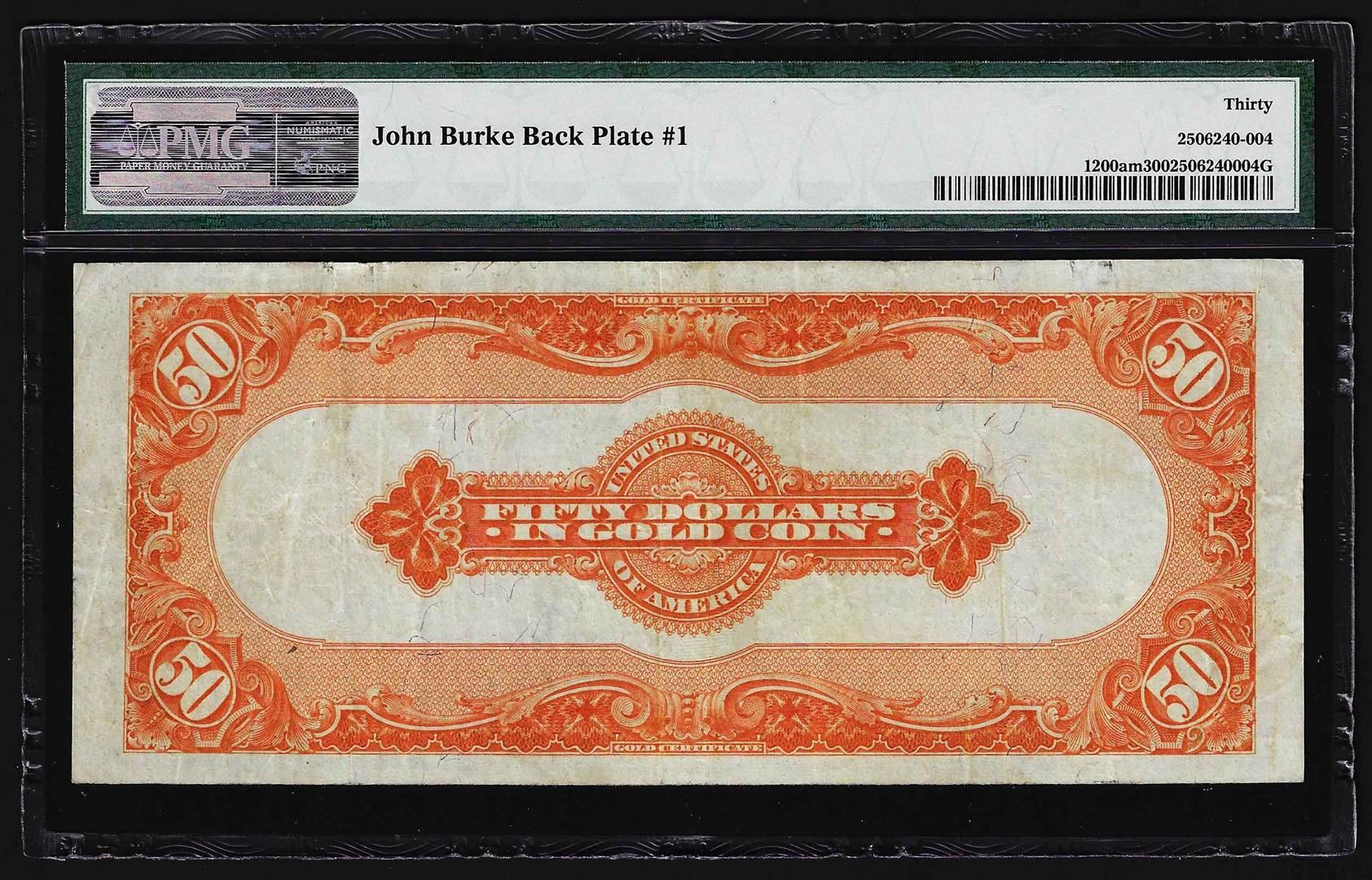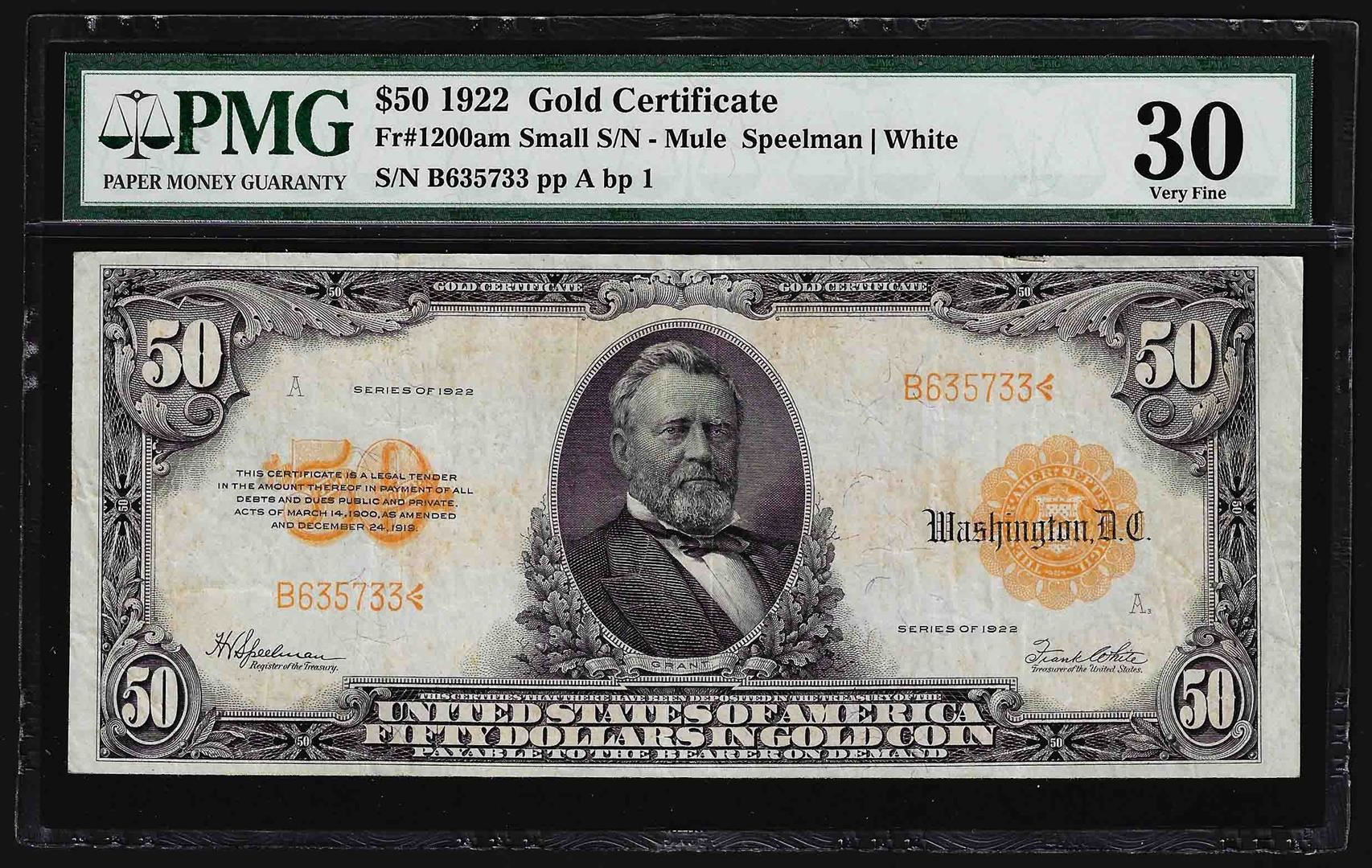 One 1922 $50 Gold Certificate Note Fr. 1200am PMG Very Fine 30 John Burke Back Plate #1. PMG Certified.