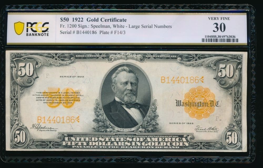 One 1922 $50 Gold Certificate PCGS 30.