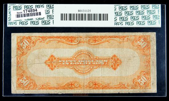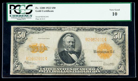 1922, $50 Gold Certificate. PCGS Very Good 10. . Fr-1200. This Fifty saw some hard time in the channels of commerce, but survived to tell its story.