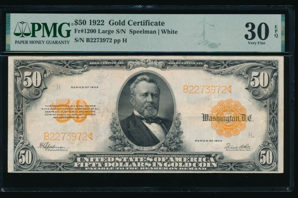 One 1922 $50 Gold Certificate PMG 30EPQ.
