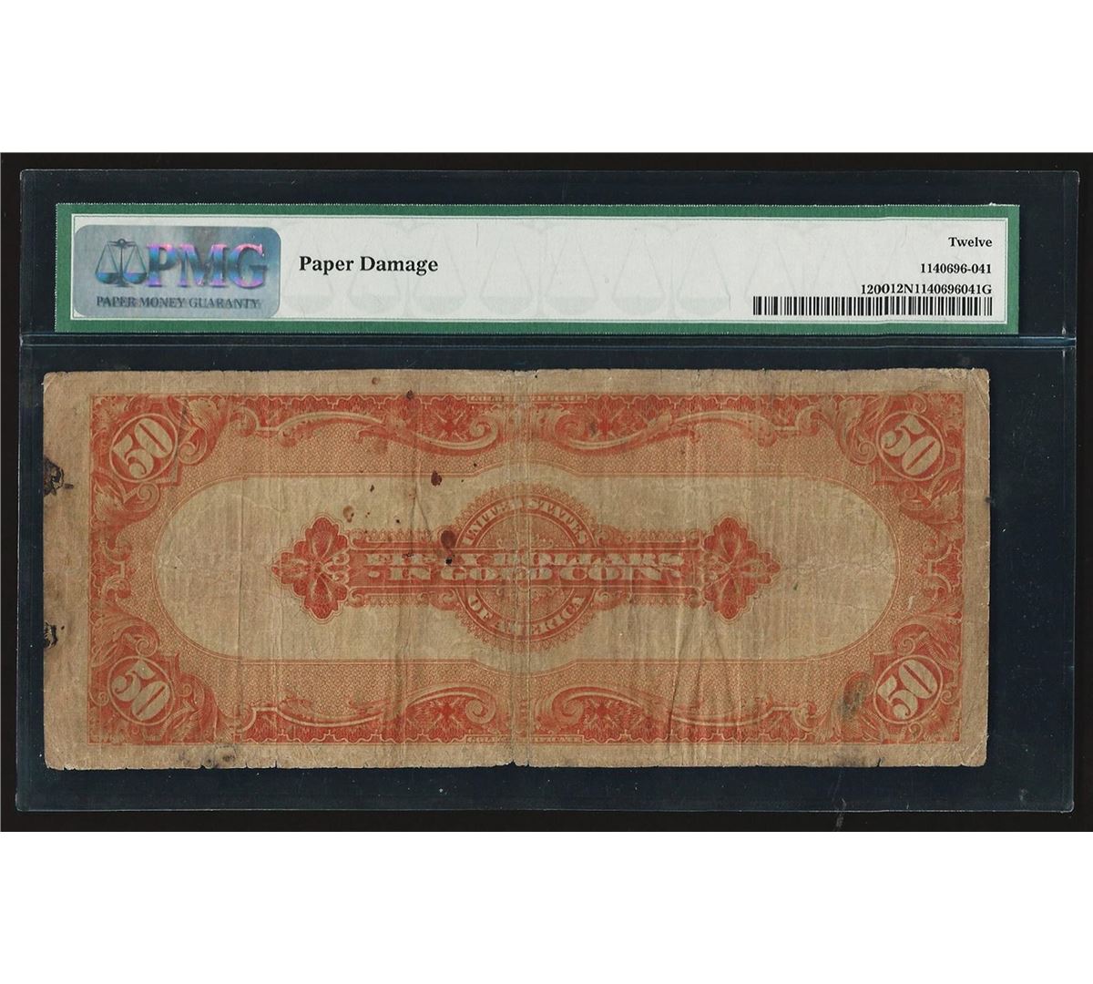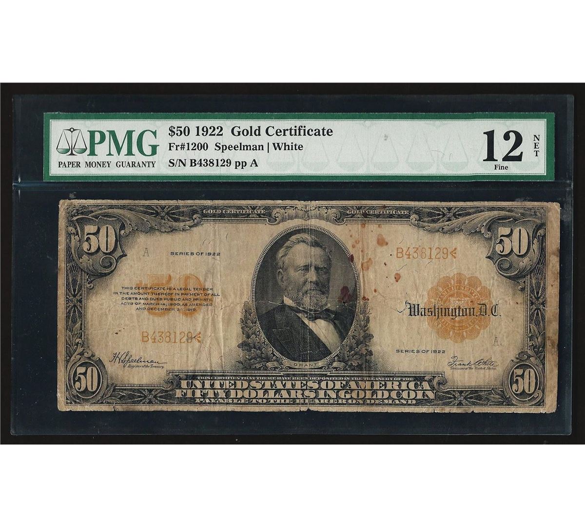 One 1922 $50 Large Size Gold Certificate PMG F12 Net. PMG Certified.
