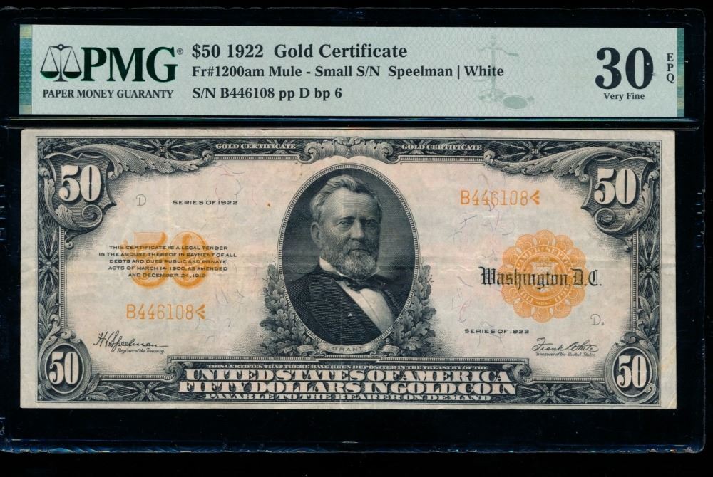 One 1922 $50 Mule Gold Certificate PMG 30EPQ.