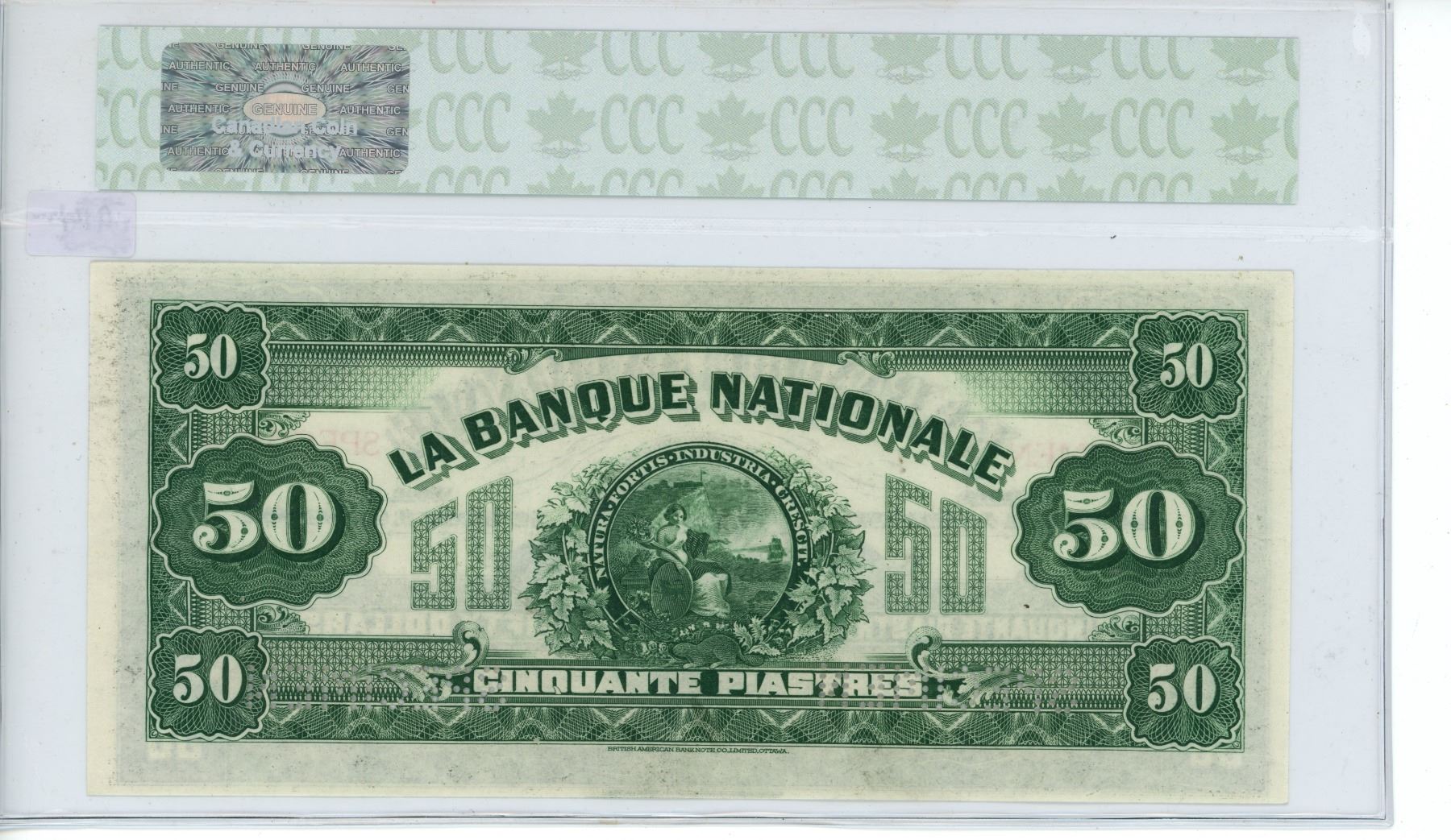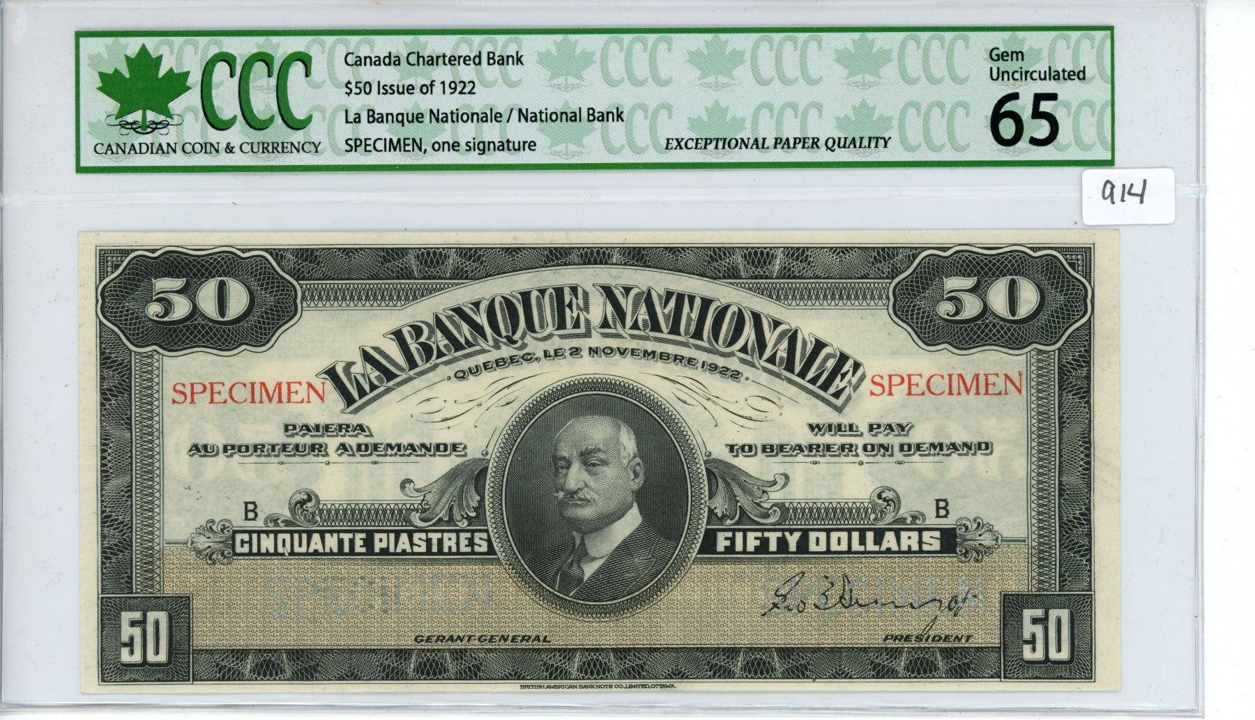 1922 $50 issue Quebec National bank Specimen bill - CCC graded, Gem UNC 65