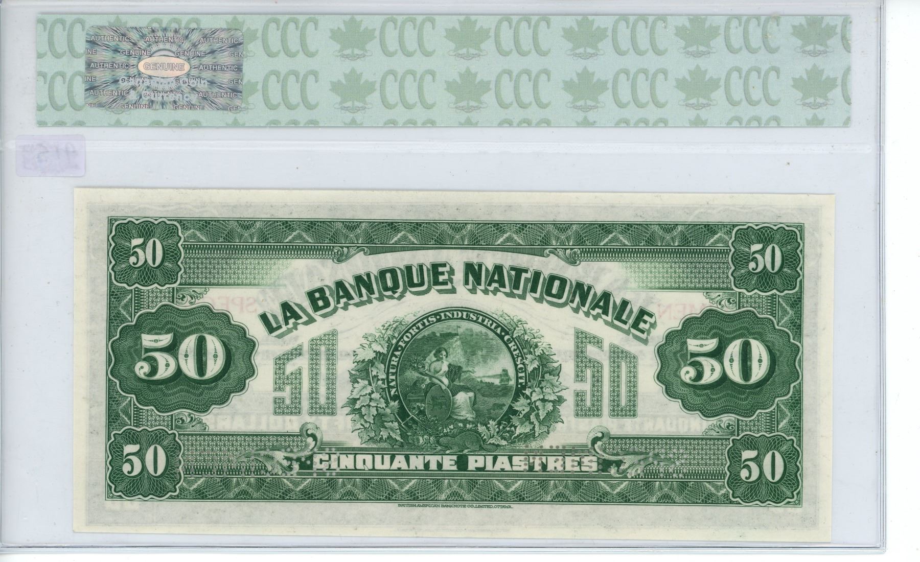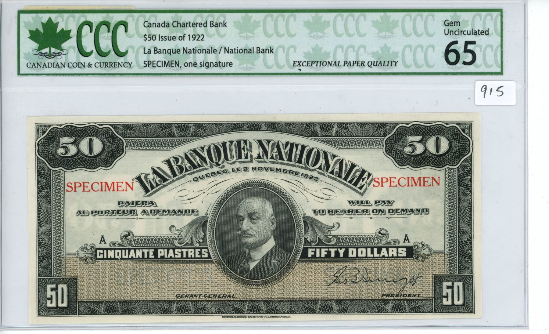 1922 $50 issue Quebec National bank Specimen bill - CCC graded, Gem UNC 65