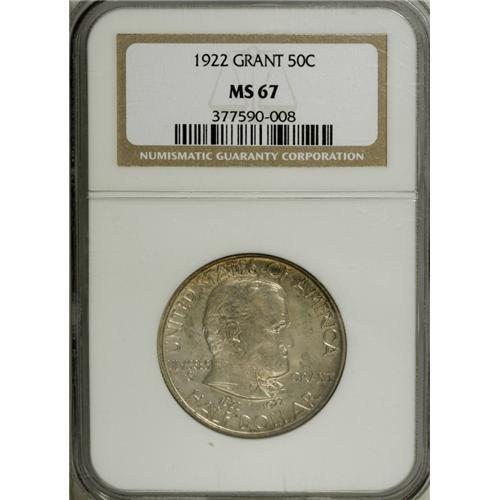 <B>1922 50C Grant no Star MS67 NGC.</B></I> Although not as rare as its With Star counterpart, the 1922 Grant commemorative is worthy of special bidder consideration at the Superb Gem grade level. Pleasing smoky-lilac toning covers both sides, while slightly deeper colors are noted near the reverse periphery. The surfaces are satiny in luster quality with a noteworthy lack of abrasions. Census: 25 in 67, 1 finer (12/06).<BR><BR><b>Shipping:</b> Coins & Currency (<a target="_blank" href="http://www.heritageauctions.com/common/shipping.php">view shipping information</a>)