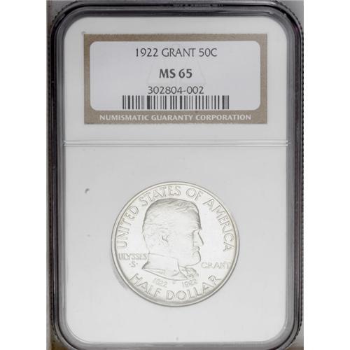 <B>1922<50C> Grant no Star MS65 NGC.</B></I> Ash-gray color blankets each side of this well struck Gem. A pleasing satiny sheen illuminates the impeccably preserved surfaces. As always, numerous wispy die polish lines are noted in the obverse fields. <BR><BR><B>Important notice:</B> Heritage usually auctions material at the rate of 200-250 lots per hour. On some occasions eBay Live bid software or the Internet may not be able to keep up with the pace of the auction. We recommend placing a realistic absentee bid now as insurance to avoid disappointment. Occasionally the auctioneer may eliminate or reject an eBay Live bid, and the auctioneer may also reopen a lot after the close of the eBay live bidding (usually because we missed an audience bid), and may reject your bid even if it shows you as the winning bidder. By bidding via eBay Live, you agree that Heritage may award the lot to another bidder at its sole discretion under the circumstances described above or any other reasonable circumstances. Since eBay bids are not shown to us until we open the lot on the floor, we treat those bids just like floor bids. In most cases the floor responds before the eBay bid is presented to us, due to Internet lag time, so for consistency we have made it a policy that floor bids are always considered first over tie eBay live bids. Also please note that all Heritage lots purchased through eBay Live carry a 20% Buyer's Premium. Please make sure you read the Terms and Conditions before you bid. This lot is being auctioned in conjunction with a live floor auction by Heritage Galleries & Auctioneers. All final auction and invoice information will be supplied by Heritage Galleries & Auctioneers, and all other information should be considered preliminary. Lot:4939 <BR><BR><B>Winning Notification and Billing:</B> After the FINAL session in this auction is complete, Heritage will send e-mail and snail mail invoices. This process normally takes several days. All final auction and invoice information will be supplied by Heritage Galleries & Auctioneers, and all other information should be considered preliminary. <BR><BR>This auction will be conducted on a live auction floor and over the Internet through eBay Live. If you choose to place an absentee bid, please take a moment to <font color='#0000ff'><u><a href='http://pages.ebay.com/liveauctions/help/before/laabsentee.html'>learn how eBay Live absentee bidding works</a></u></font><font color='#000000'>