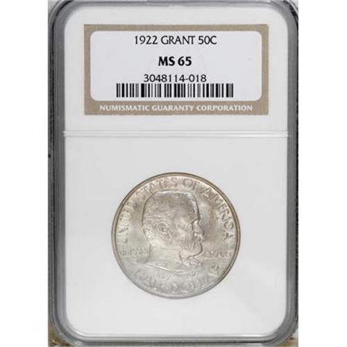 <B>1922 50C Grant no Star MS65 NGC.</B></I> A satiny Gem with ivory surfaces and splashes of iridescence on each side. The design features are fully defined, within the limits of the original coinage dies.<BR><BR><b>Shipping:</b> Coins & Currency (<a target="_blank" href="http://www.heritageauctions.com/common/shipping.php">view shipping information</a>)
