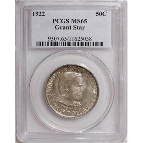 <B>1922 50C Grant with Star MS65 PCGS.</B></I> A satiny pearl-gray Gem with medium honey-gold and steel-blue toning. An unabraded and clearly original example of this low mintage issue. This dies clashed for this variety early in its life. The clash marks above GRANT were removed by a mint worker, at the cost of raised striations (as made) across the right obverse field. Vestiges of the clash marks persist left of the G in GRANT.<BR><I>From The Frank DuVall Collection of U.S. Commemoratives.</B></I><BR><BR><b>Shipping:</b> Coins & Currency (<a target="_blank" href="http://www.heritageauctions.com/common/shipping.php">view shipping information</a>)