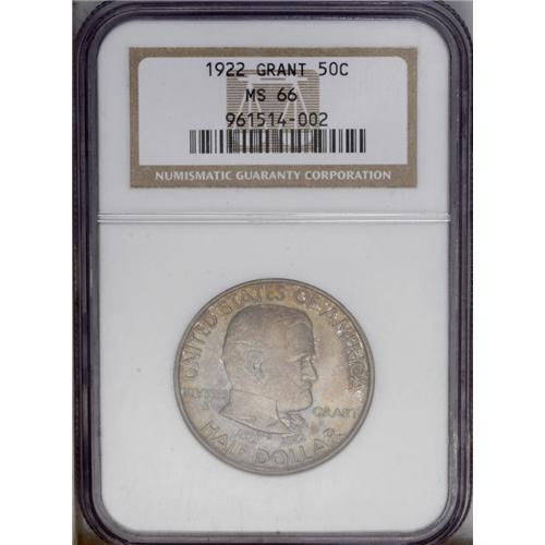 <B>1922<50C> Grant no Star MS66 NGC.</B></I> Fully struck with gorgeous mauve-gray, rose, amber, and sea-green toning, on both sides. The luster is unimpaired, and there are just a couple of small, shallow marks in the right obverse field. A magnificent Premium Gem, with outstanding eye appeal.<BR><I>From The Alexander Collection.</B></I>