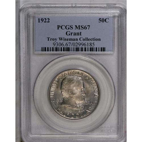 <B>1922<50C> Grant no Star MS67 PCGS.</B></I> Light lilac and ice-blue toning accents the obverse; the reverse has just a hint of gray-gold in the centers, with good brilliance on both sides. This well-struck piece is among the less than three dozen finest graded at PCGS (8/06).<BR><I>From The Troy Wiseman Collection.</B></I>