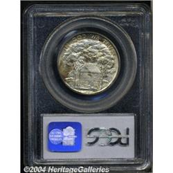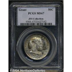 <B>1922<50C> Grant no Star MS67 PCGS.</B></I> This typically sharply detailed Superb Gem displays an uneven, rather quilt-like toning pattern, on the obverse, with patches of red-orange, indigo-gray, and turquoise color in evidence, and a smaller degree of crimson-orange and dark-green patina also splashed in small, random patterns on the reverse. Numerous wispy die striations (as struck) are on display in the obverse fields, while a few, but very few superficial surface blemishes are detected using a magnifier. Conditionally scarce, with none finer at PCGS. Population: 30 in 67, 0 finer (3/04).<BR><I>Ex: Long Beach Signature Sale (Heritage, 6/01), lot 6857, which realized $3,220.</B></I><BR><I>From the JFS Collection, the #1 All-Time PCGS Registry Set.</B></I> <BR><BR><B>Important notice:</B> Heritage usually auctions material at the rate of 200-250 lots per hour. On some occasions eBay Live bid software or the Internet may not be able to keep up with the pace of the auction. We recommend placing a realistic absentee bid now as insurance to avoid disappointment. Occasionally the auctioneer may eliminate or reject an eBay Live bid, and the auctioneer may also reopen a lot after the close of the eBay live bidding (usually because we missed an audience bid), and may reject your bid even if it shows you as the winning bidder. By bidding via eBay Live, you agree that Heritage may award the lot to another bidder at its sole discretion under the circumstances described above or any other reasonable circumstances. Since eBay bids are not shown to us until we open the lot on the floor, we treat those bids just like floor bids. In most cases the floor responds before the eBay bid is presented to us, due to Internet lag time, so for consistency we have made it a policy that floor bids are always considered first over tie eBay live bids. Also please note that all Heritage lots purchased through eBay Live carry a 20% Buyer's Premium. Please make sure you read the Terms and Conditions before you bid. </span></font></tr></table></td></tr></table>