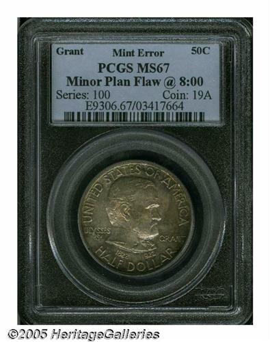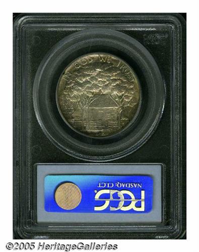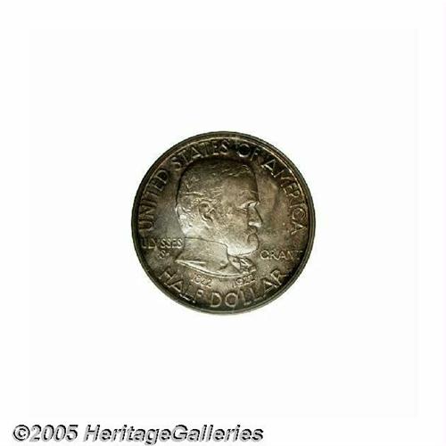 <B>1922<50C> Grant no Star--Minor Planchet Flaw at 8 O' Clock--MS67 PCGS.</B></I> A tiny planchet lamination is located on the obverse rim to the left of the H in HALF. More important to the value of this coin, though, is the exceptional condition and original surfaces. The No Star is the more frequently encountered of the two variants of Grant halves, but in MS67 condition this is a very significant and highly desirable type coin. Even through the toning, the fields show the usual swirling die striations which impart a brightness to the fields. Each side is accented by moderate golden-gray and rose accents of color that deepen slightly in hue toward the rims. Essentially flawless with no obvious abrasions to the unaided eye.