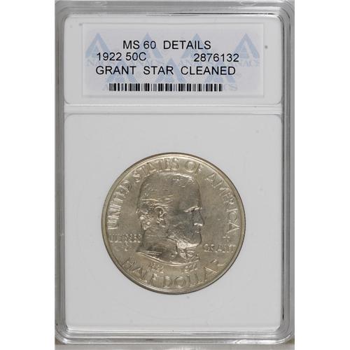 <B>1922<50C> Grant with Star--Cleaned--ANACS. MS60 Details.</B></I> The Grant Star obverse die was boldly clashed early in its life, and the die was lapped at the mint to reduce the effect of the clash marks. This caused numerous obverse field striations of mint origin. Hairlines are not apparent, but the lightly toned surfaces are slightly subdued, and a few small marks are noted near Grant's eyebrow.