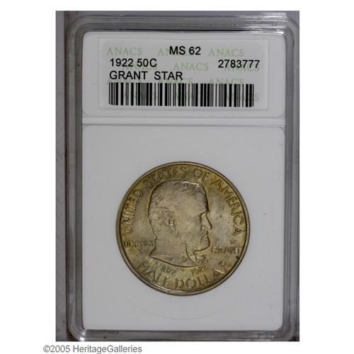 <B>1922<50C> Grant with Star MS62 ANACS.</B></I> Lime green toning covers this mark free example of the rare Grant w/star issue.