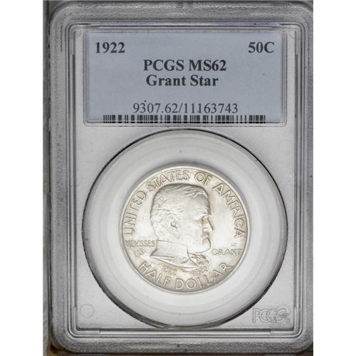 <B>1922<50C> Grant With Star MS62 PCGS.</B></I> Wisps of reddish-gold visit portions of the obverse periphery of this low mintage variety. The design elements are for the most part adequately struck. A couple of shallow linear abrasions are visible on Grant's collar.