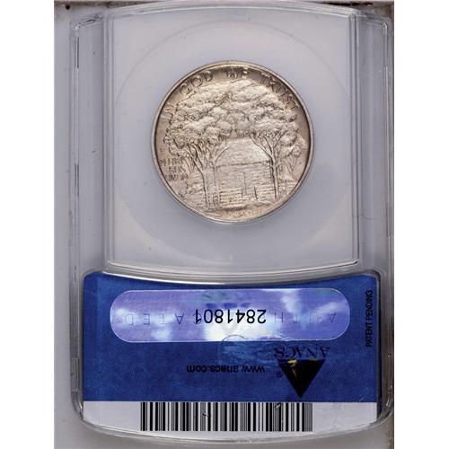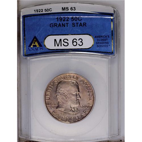 <B>1922<50C> Grant with Star MS63 ANACS.</B></I> ANACS blue-label holder. A typical satiny Mint State example of this issue with heavy die polish lines in the fields. The obverse has lovely grayish-gold color while the reverse has lighter gold toning. A pleasing example of this scarce commemorative variety.