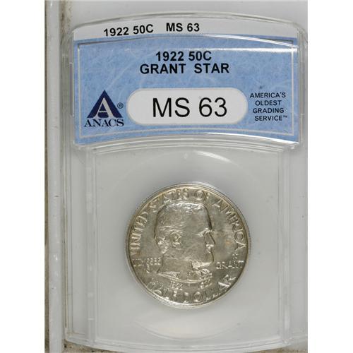 <B>1922 50C Grant with Star MS63 ANACS.</B></I> Bright luster emanates from both sides of this key-date With Star commemorative, and the design elements reveal excellent detail. The only color apparent is located in the right obverse field, where a few dapples of faint brown and green toning reside. Numerous die polish lines are noted in the fields of both obverse and reverse.<BR><BR><b>Shipping:</b> Coins & Currency (<a target="_blank" href="http://www.heritageauctions.com/common/shipping.php">view shipping information</a>)